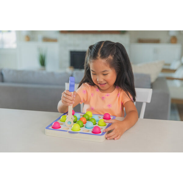 Develop skills in patterning, sequencing, and colour matching by arranging spheres to match pattern cards. This set enhances matching, counting, and fine motor skills, featuring a wooden frame, five double-sided pattern cards, 25 wooden spheres, and Easy Tweezies squeezers. Ages 3Y+.